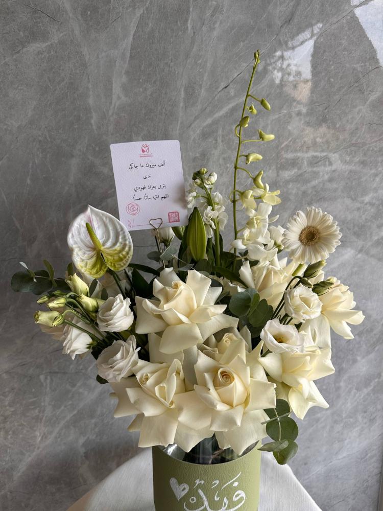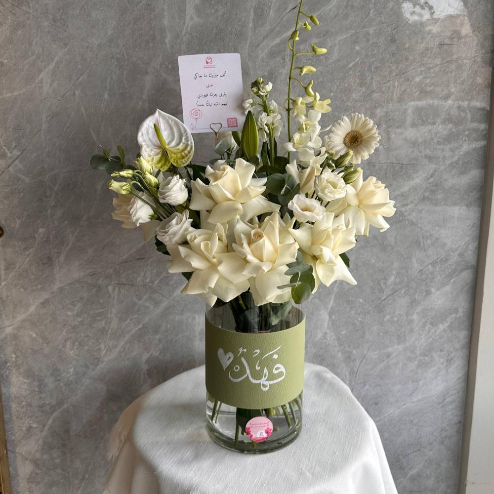 نقاء يبعث الطمأنينة 🌸✨ مع فازة أنيقة بتنسيق ورد طبيعي أبيض يمنح المكان أجواء مفعمة بالسلام والجمال.