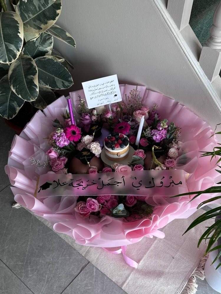 لأجمل خريجة… صممنا لكِ هذه الباقة الفاخرة التي تجمع بين تنسيق ورد أنيق يعكس الفخر والفرح، مع كيكة التوت الغنية بالنكهة. هدية مثالية لتخليد أجمل لحظات التخرج، وتعبّر عن التقدير والاحتفال بأناقة.