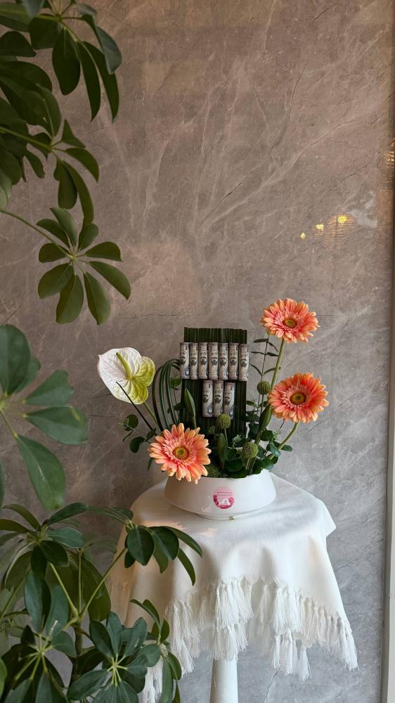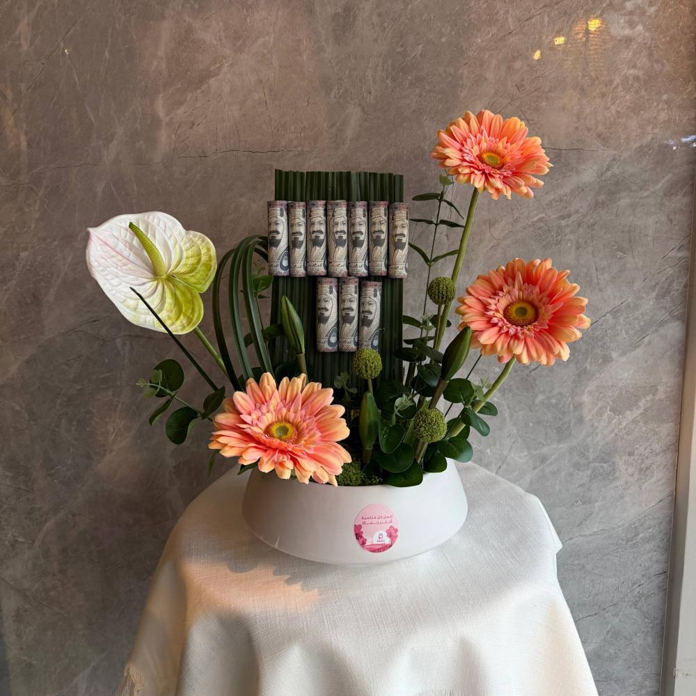 تنسيق مبتكر يجمع بين الورد الطبيعي الوردي وتغريسة من النقود الملفوفة داخل فازة سيراميك فاخرة 💐💸. مزيج راقٍ يعكس الذوق والكرم في آنٍ واحد، مناسب لهدية تخرج تعبّر عن التقدير، أو نجاح يحتفل بالإنجاز، أو شكر لأحد غالٍ.