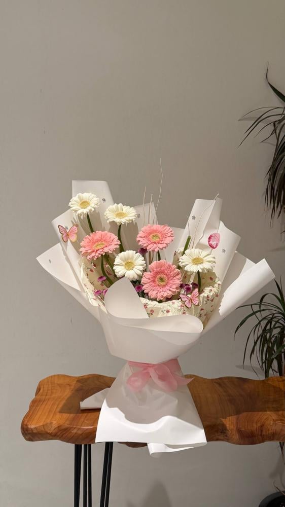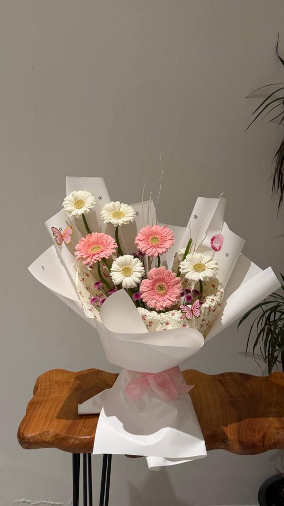 باقة أنيقة تجمع بين ورد الجيربيرا الوردي والأبيض الطبيعي بتنسيق متوازن داخل تغليف أبيض فاخر 🎀. تضيف الفراشات الصغيرة لمسة من الخفة والبهجة، لتجعلها خيارًا مثاليًا لهدية عيد ميلاد، تهنئة تخرج أو استقبال مولود 💗. تنسيق ناعم ينبض بالحياة ويعبّر عن الجمال والرقة في كل تفصيلة.