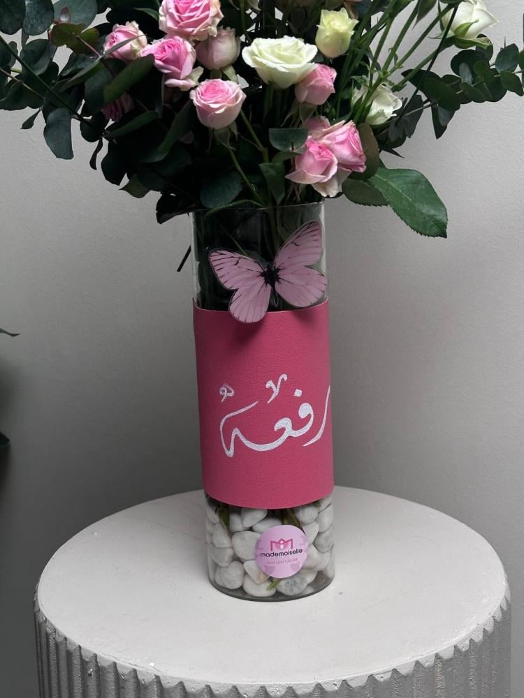 تنسيق استثنائي يجمع بين الورود الوردية والبيضاء مع لمسات من الأوراق الطبيعية، في فازة زجاجية مزينة بالحصى الأبيض، مما يمنحها مظهرًا أنيقًا وفريدًا.